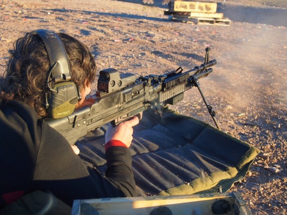 and as the afternoon wore on, so did the sound of gunfire. This was no ordinary gunfire, whatever was making this noise was full auto and a large caliber. After about an hour of riding I came upon the source, a few families enjoying some time in the desert and the thing I was looking for – a full auto, belt fed, M60 machine gun. I would love to have been able to read their minds as I, a hippie looking guy on a bicycle, came riding up. Regardless of what they may have thought, they were as nice as can be and after offering me water and food, I received the offer I was hoping for – the opportunity to shoot a few rounds. First up was a suppressed .223 AR,