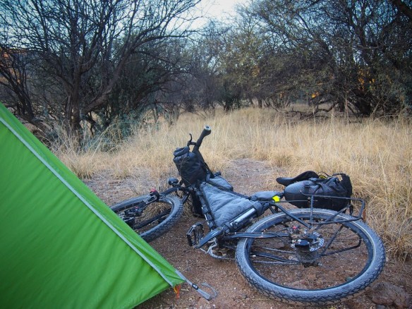 I had expected difficult route finding, but in fact the trail is well marked and easy to follow without a GPS. The terrain varied from well packed and fast soil, to copper laden gravel, to baby head rocks, but most all of it was rideable even with my loaded bike. Towering Saguaro cactus dominated the landscape