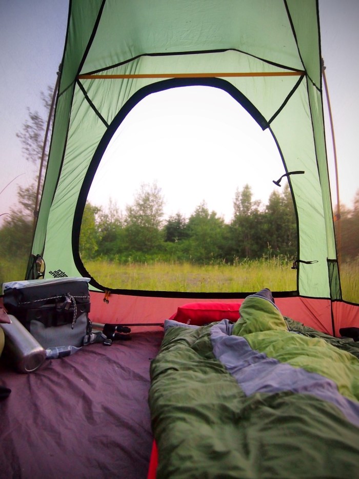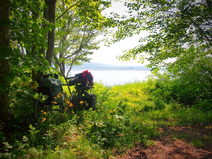 and a good day to put on some miles. I’ll admit, at this point I shifted into get home mode and just put my head down and pedaled. The day was hot and there was a headwind, but I just climbed into my shell and rode as far as I could. By evening I was pretty spent and after stopping at a house to fill my water bottles, I was given directions to a pretty good camping spot right on the shore of Bras d’Or Lake.
